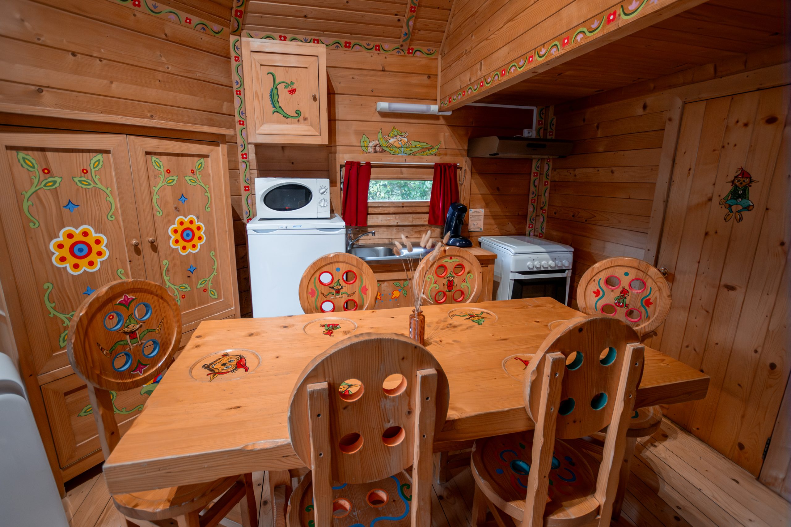 Cabane en bois colorée avec décorations ludiques et mobilier en bois.