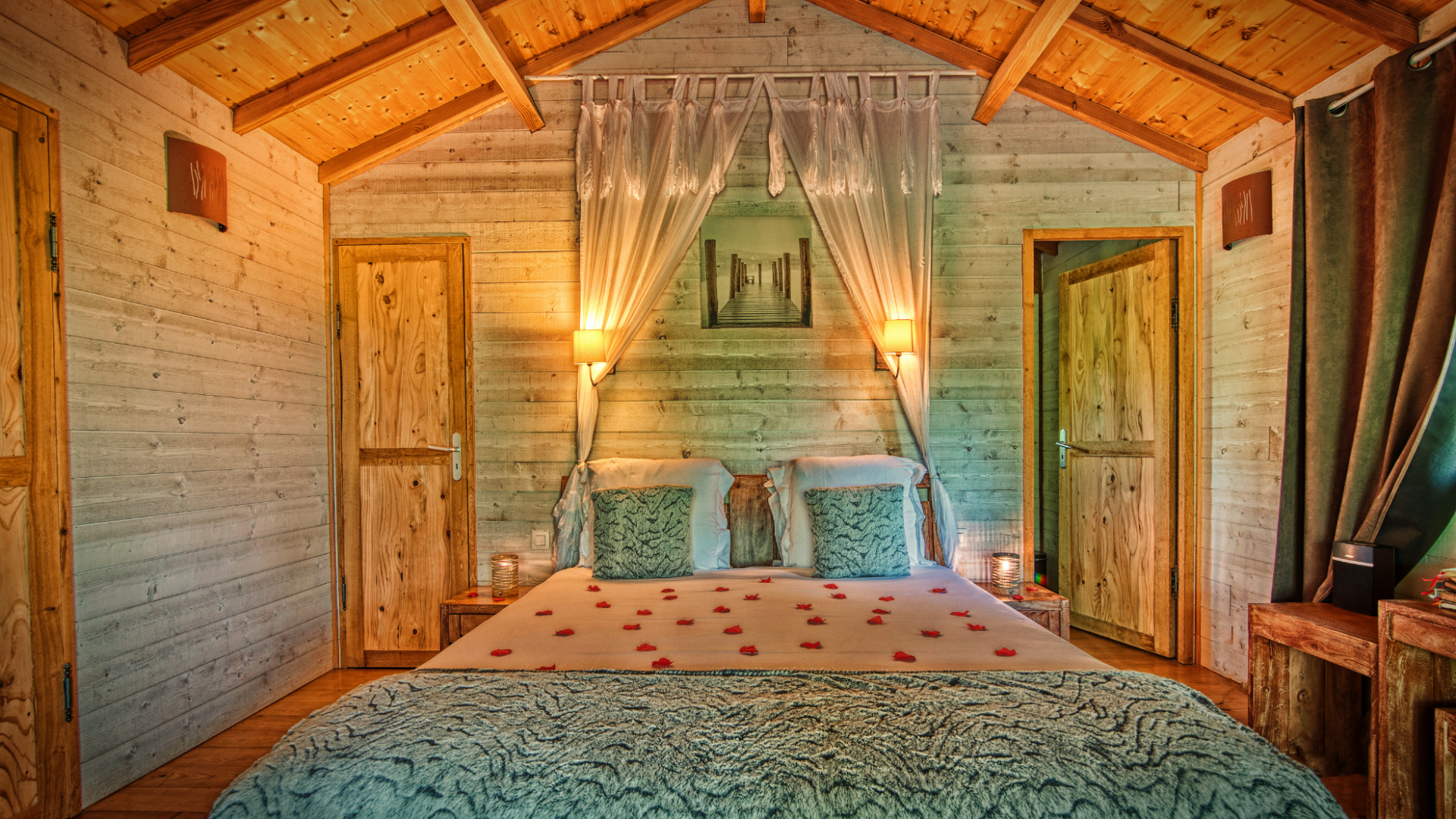 Chalet en bois avec lit décoré de pétales de roses, ambiance romantique et chaleureuse.
