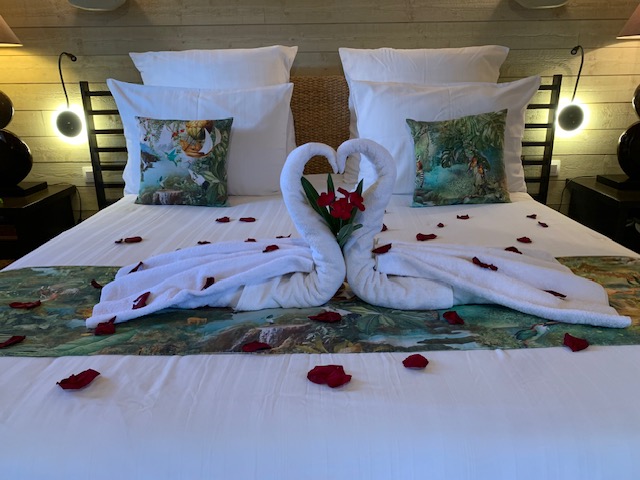 Un coin de Paradis, qui permet de cocooner dans un lit King Size, avec le champagne au frais, le SPA sur la terrasse, le dîner fin et le petit déjeuner hissé dans un panier ! Béatrice et Tony, les maîtres des lieux y attendent les amoureux, dans un décor exotique directement importé de Thaïlande. Un retour à la nature, dans le luxe et le confort pour un tête-à-tête inoubliable et sensuel !