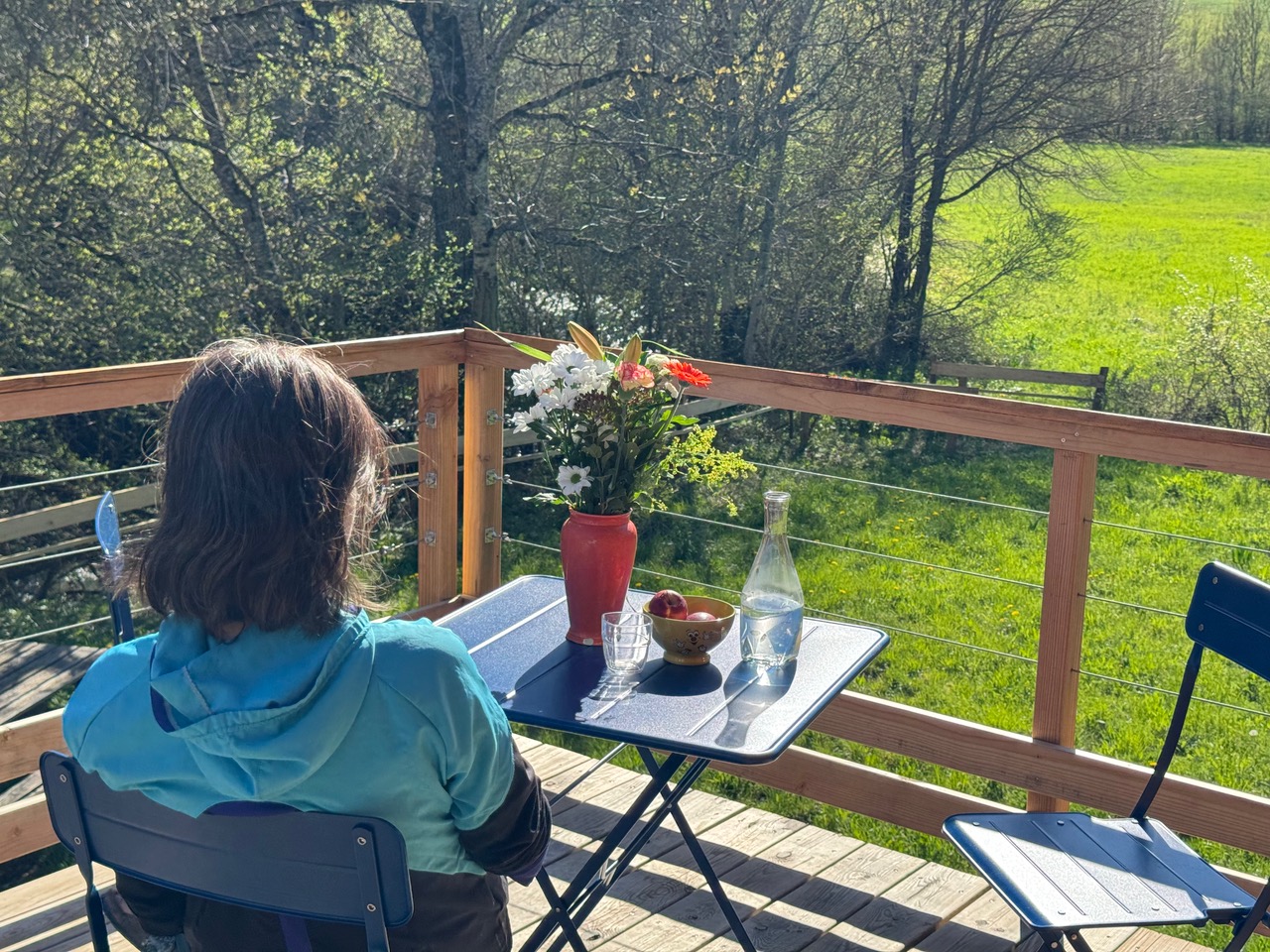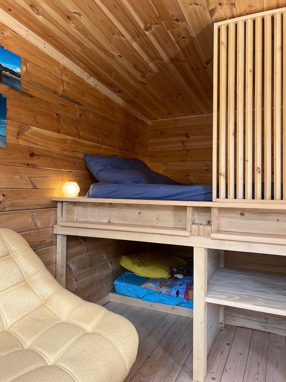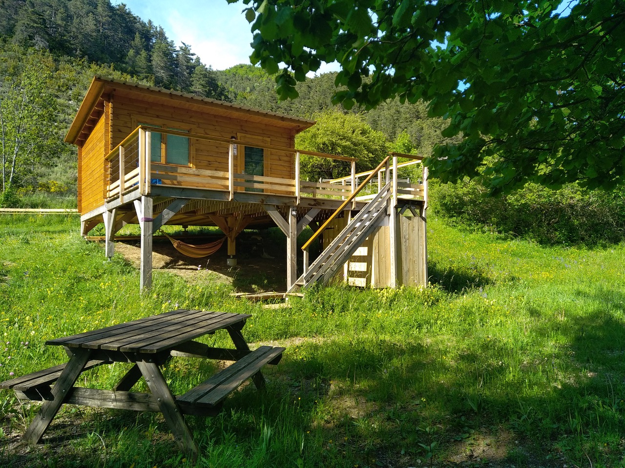 La Cabane Nature se compose d’une pièce de 19m2 avec un lit 2 places surélevé de 3 marches et 1 lit une place en dessous. Un coin salon et un coin cuisine vous permettent d’être autonome : frigo, évier et plaques de cuisson au gaz. Une grande terrasse de 25m2 surplombe le terrain au bord duquel coule une petite rivière de montagne. Sous la cabane se trouve la salle de bain avec un petit évier et une douche. La cabane est autonome en énergie solaire et en eau chaude solaire, et équipée de toilettes sèches extérieures.
