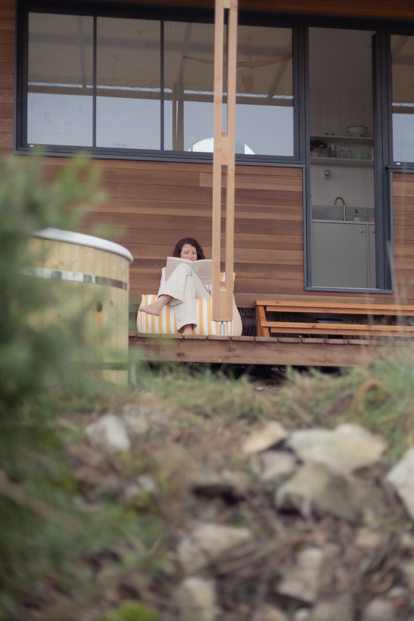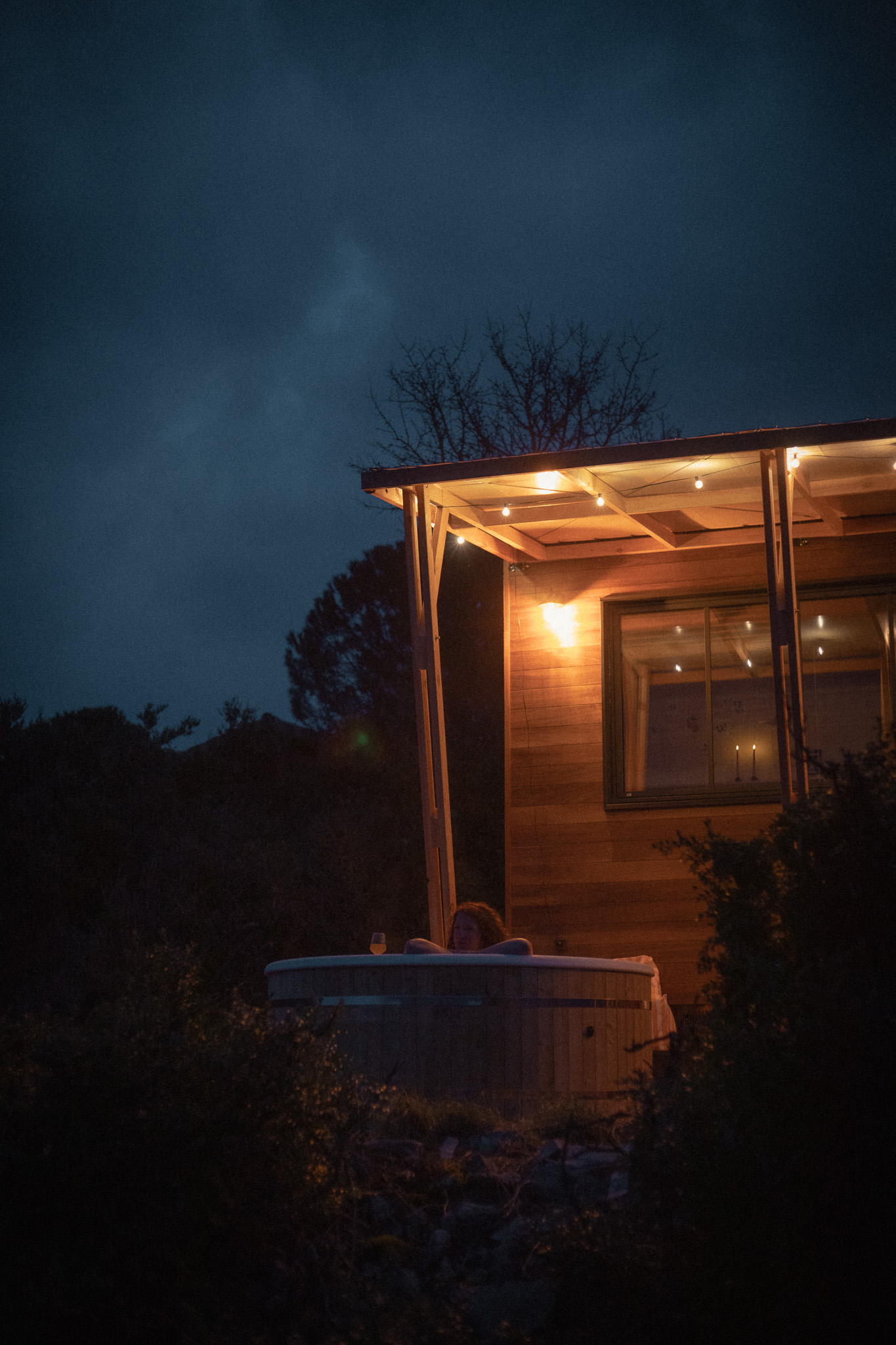À l’extérieur, la terrasse devient un véritable espace de vie. Vous pourrez vous détendre dans le jacuzzi privé tout en admirant les paysages ardéchois qui s’étendent à perte de vue. Le soir venu, laissez-vous envelopper par le silence de la nature et profitez du ciel étoilé, loin de l’agitation du quotidien.