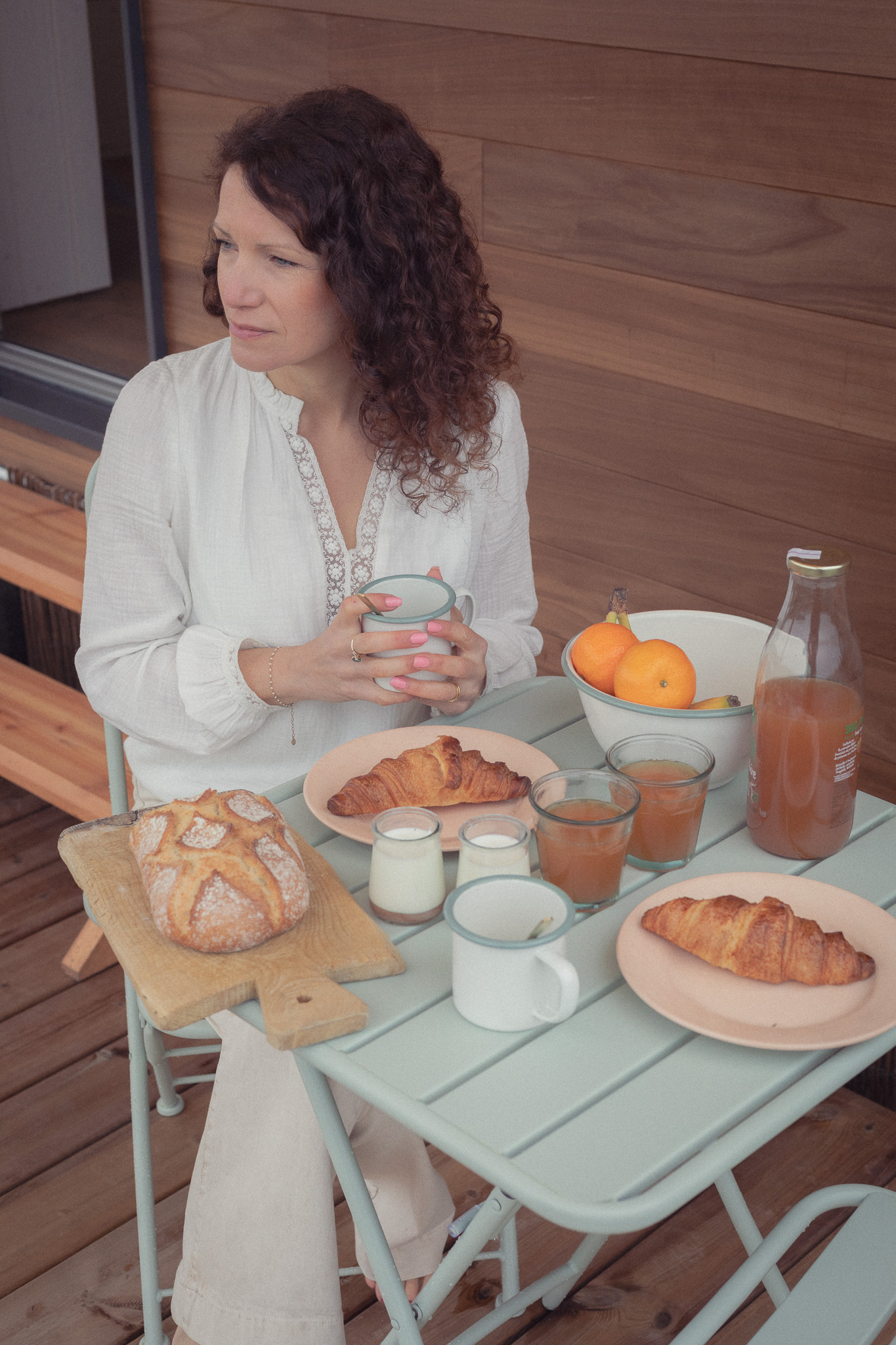 La cuisine est entièrement équipée pour préparer vos repas sur place, et sur demande, un panier petit-déjeuner peut être livré directement sur la terrasse, préparé avec des produits locaux et faits maison.
