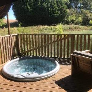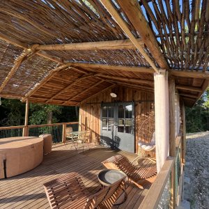 Cabane en bois sur pilotis avec jacuzzi et sauna