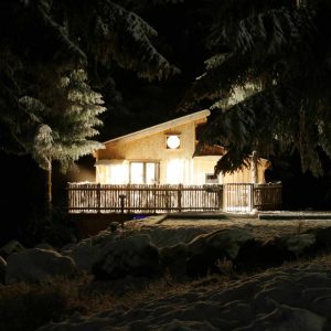 Chalet en bois avec terrasse, entouré de verdure et darbres majestueux.