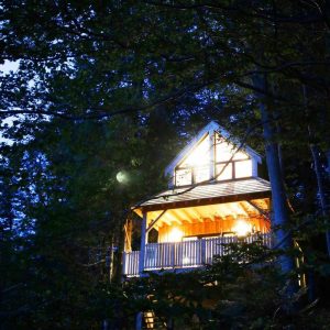 Cabane dans les arbres illuminée, avec une terrasse et des escaliers en bois.