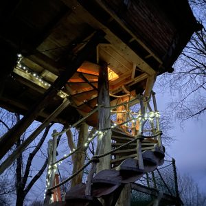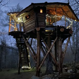 Cabane dans les arbres avec balcons et éclairage chaleureux, entourée de verdure.