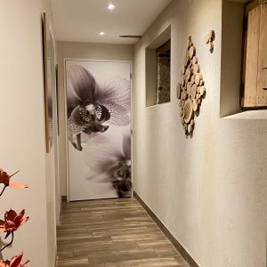 Salle de bain moderne dun hébergement insolite en Languedoc-Roussillon, avec fleurs et bois.