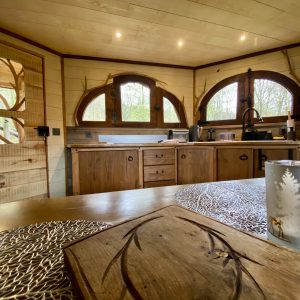 Cabane en bois chaleureuse avec lit douillet et kitchenette intégrée.