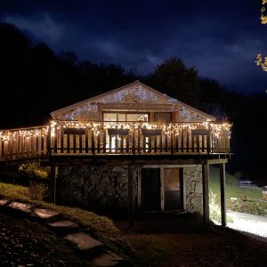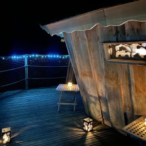 Cabane romantique avec jacuzzi, éclairage doux et roses sur la terrasse.