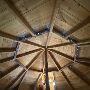 Hébergement insolite : yourte en bois avec lit douillet et ambiance chaleureuse.