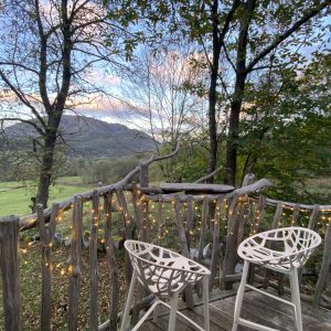 Cabane dans les arbres avec vue, petit-déjeuner sur la terrasse en bois.