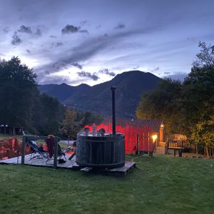 Cabane en bois avec jacuzzi extérieur, vue sur le coucher de soleil.