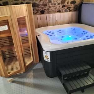 Hébergement de type gîte avec douche moderne et coin détente en bois.